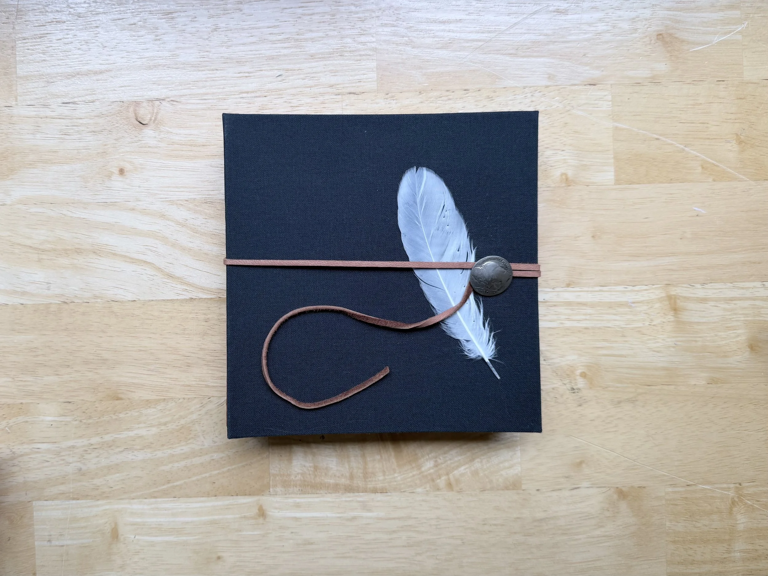 The book cover with leather wrap-around cord. The Buffalo nickel was living in my button jar for years.
